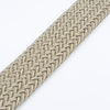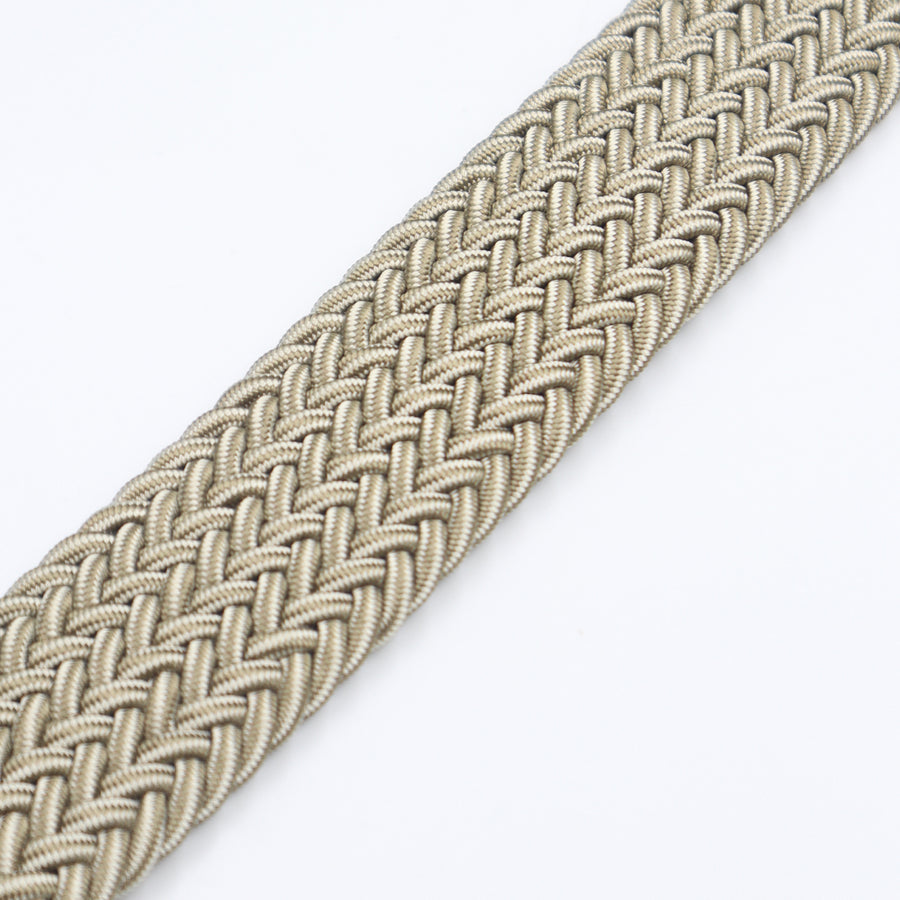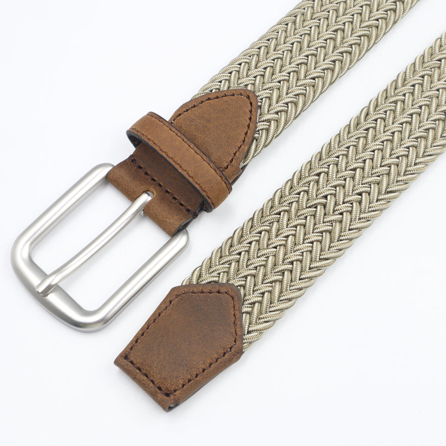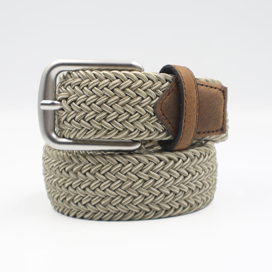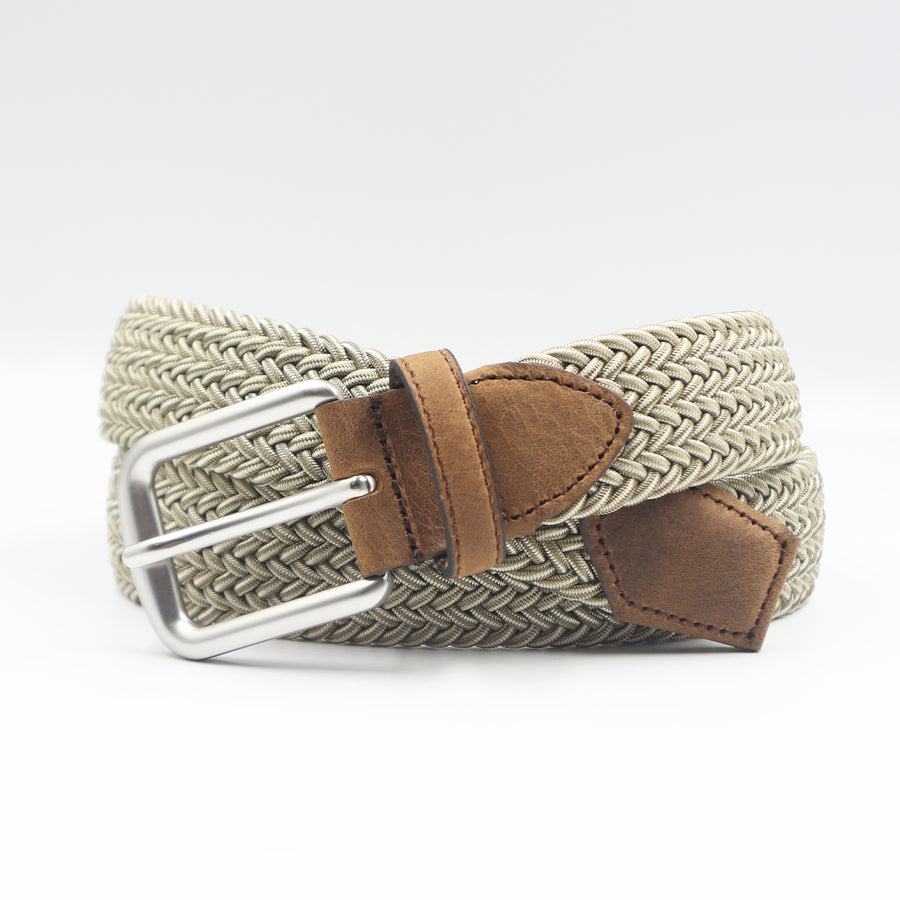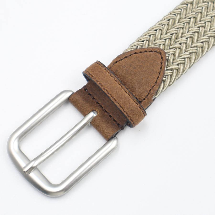 Cinturón elástico en color arena con ajuste sin perforaciones y hebilla en acabado plata mate, resistente e hipoalergénica.