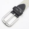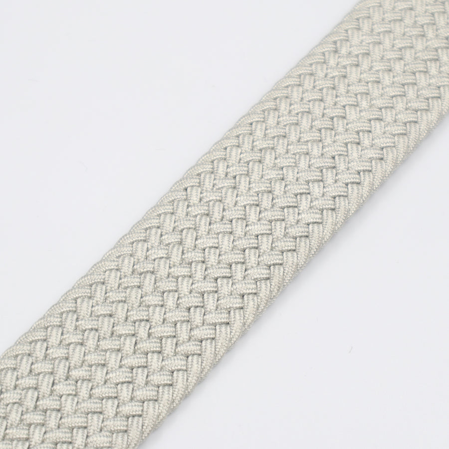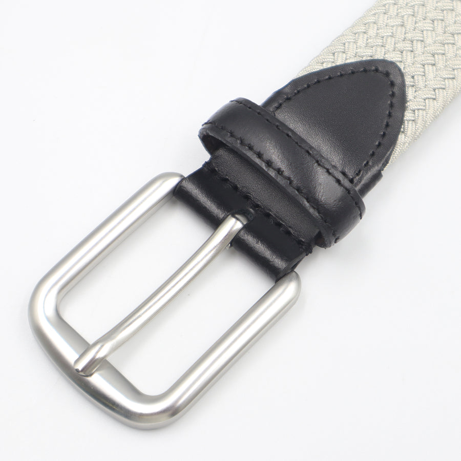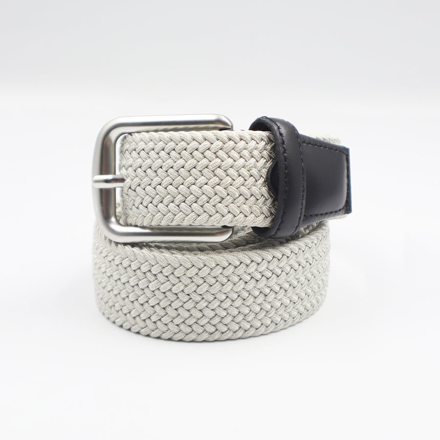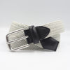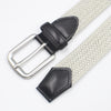 Cinturón elástico en color blanco con ajuste sin perforaciones y hebilla en acabado plata mate, resistente e hipoalergénica.