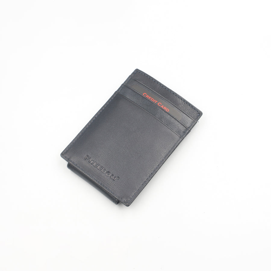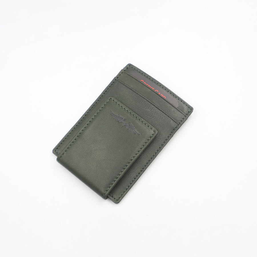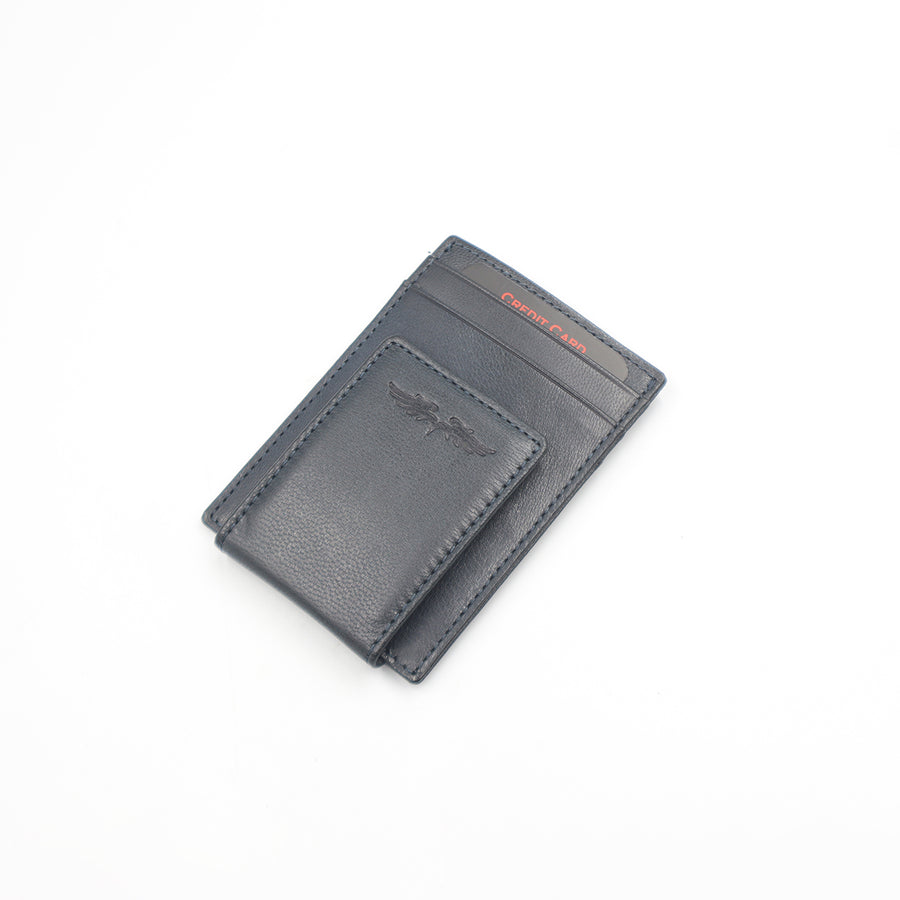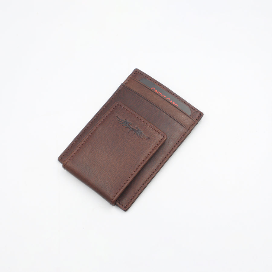 Tarjetero de piel genuina con multiples compartimentos y con clip para guardar billetes